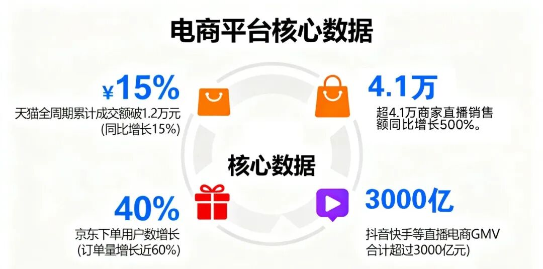 “降温”的表象下,消费市场正呈现结构性升级:天猫全周期累计成交额破1.2万亿元,同比增长15%;京东下单用户数增长40%,订单量增长近60%,手机新品成交额同比超4倍。抖音、快手等直播电商GMV合计超3000亿元,成为拉动增长的关键引擎,超4.1万商家直播销售额同比增长500%。