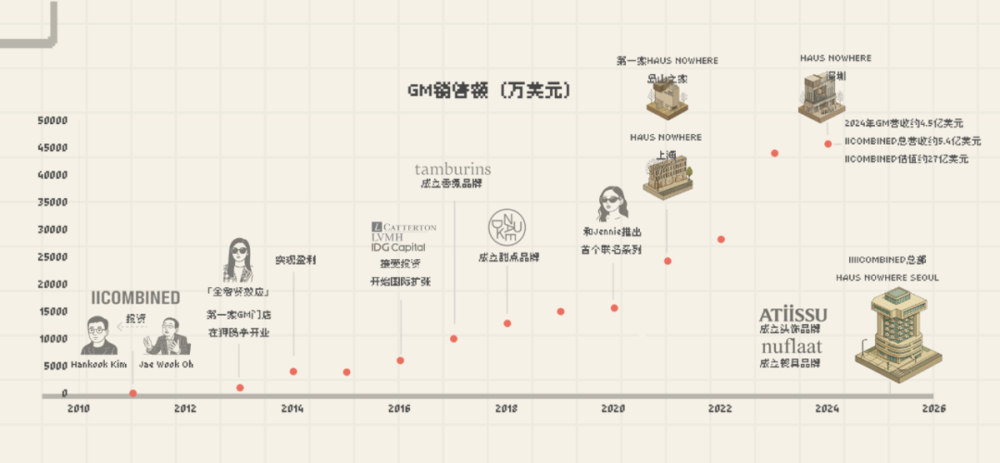 第二次跃升来自于品类的拓宽。2021年,IICOMBINED的业务触角拓宽至香氛、甜品、配饰等领域,并在首尔的岛山地区开设第一家集合店HAUS Dosan,当年销售额同比增长55%。截至目前,全球已有81家GM直营门店,和4家HAUS NOWHERE创意零售集合店。