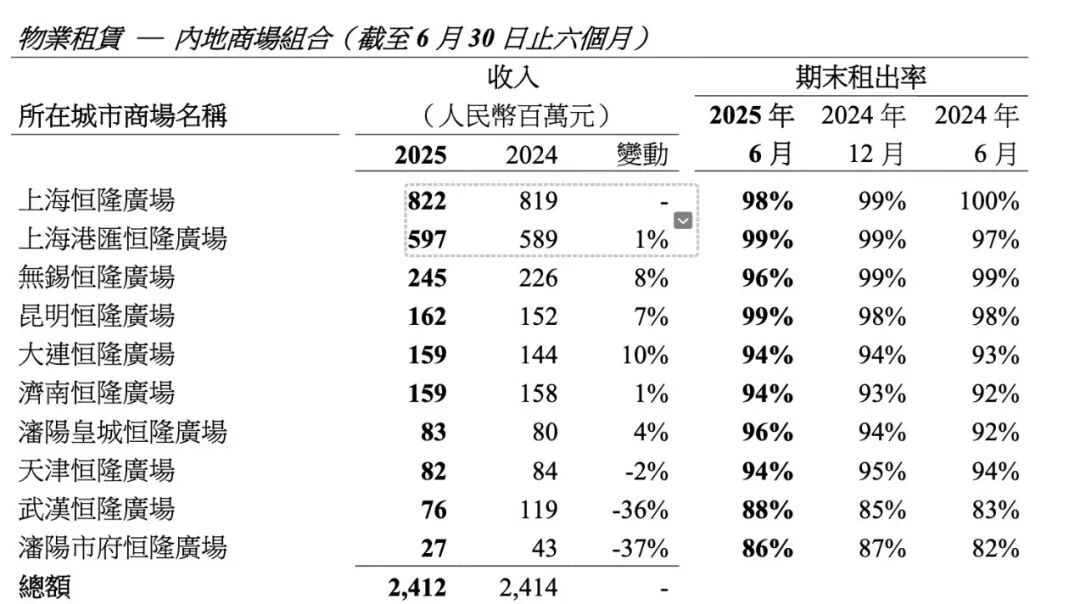 恒隆集团2025年上半年财报中指出,内地市场10座恒隆广场有7座实现收入增长,不过武汉恒隆广场和沈阳市府恒隆广场收入分别下降36%、37%。其中武汉恒隆广场须直面武汉SKP和武商MALL竞争,沈阳市府恒隆去年失去了香奈儿后,也有FRED等品牌闭店「转投」万象城,这也导致这两家商场出现大量空铺,上半年出租率分别为88%和86%。