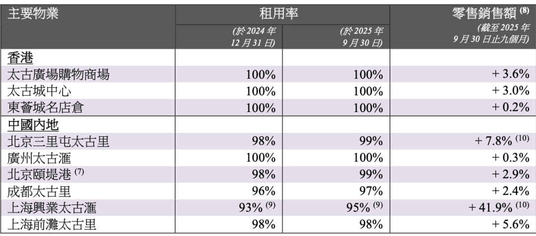 根据太古地产三季度财报,截至2025年9月30日,北京三里屯太古里零售销售额增长7.8%,出租率从去年年底的98%增长至99%;“路易号”所在的上海兴业太古汇,零售销售额更是猛涨了41.9%。