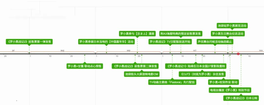 笔者整理的8月-11月期间罗小黑在日本主要活动的时间线,可以说是循序递进、环环相扣