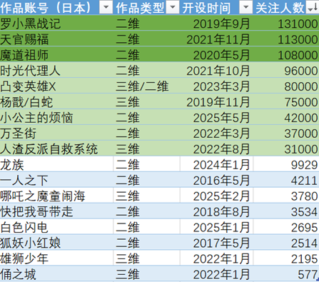 根据笔者对部分国产动画在X平台面向日本市场开设的账号关注数的整理可见:Top3的作品均为二维动画,横向对比,同样是墨香铜臭原作的《人渣反派自救系统》(3D)则没有魔道、天官的关注数多。可见带有一定异文化元素(中国特色)、二维制作的女性向作品在日本比较有市场,而运动、热血、龙傲天、奇幻等类型因日本本土作品供给充足,竞争难度大。