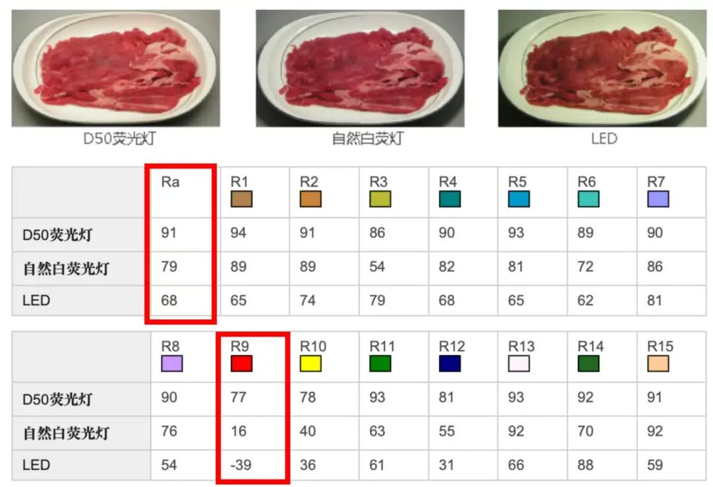 比如以下三种光源照明下的生肉看起来差别很大,核心原因就是光源的R9值不同——R9是CRI里专门管红色还原的关键指标,像生肉、番茄这类红色食物的新鲜度经常依靠它来显现。D50荧光灯的R9值有77,能把生肉的新鲜红色精准显现出来,而LED灯的R9值只有-39,红色会发暗甚至偏灰。