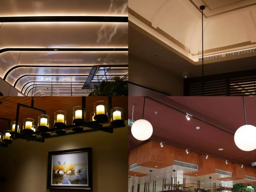 我们线下走访了北京国贸、三里屯商圈的10家漂亮饭餐厅,发现所有餐厅的光线都偏暗。这些餐厅大多使用隐藏式灯带、反光凹槽、烛台吊灯、圆形吊灯来使整个空间被均匀照亮。这些设计规避了强光直射的突兀感,借由漫反射让光线自然柔化,消费者看见的便不是刺眼的眩光,而是铺满整个空间的柔和光线。