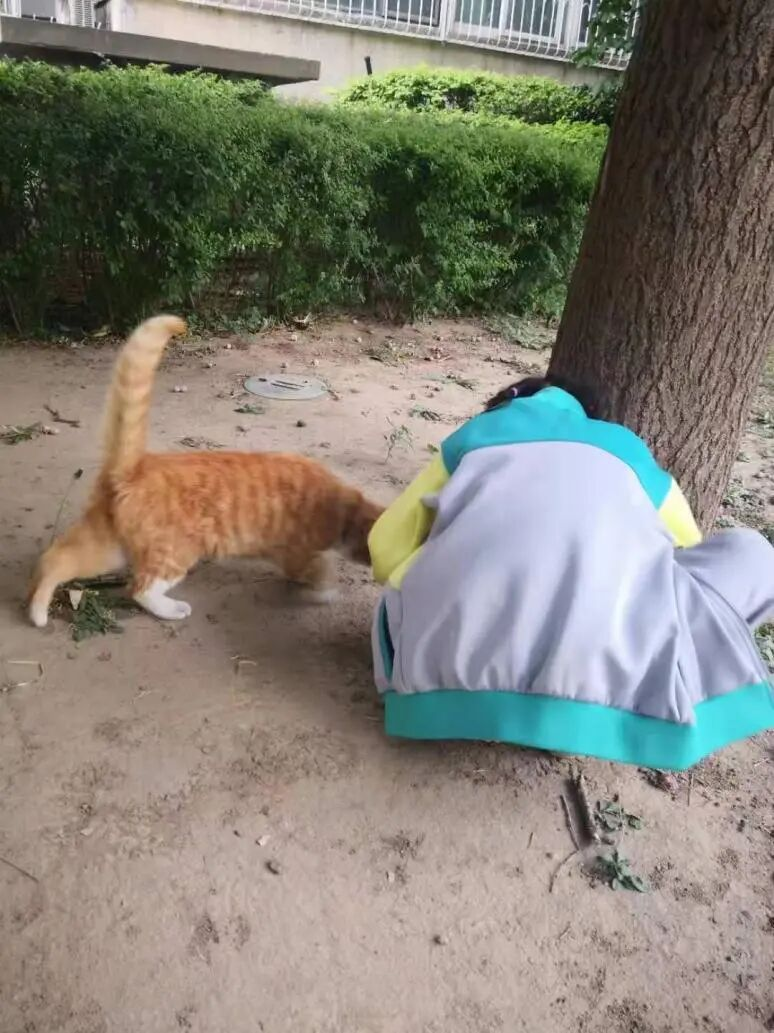 女儿和小区的流浪猫黄黄一起玩。受访者供图