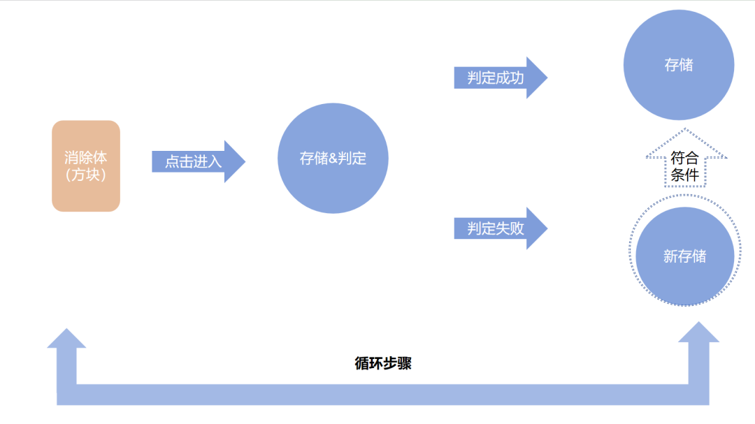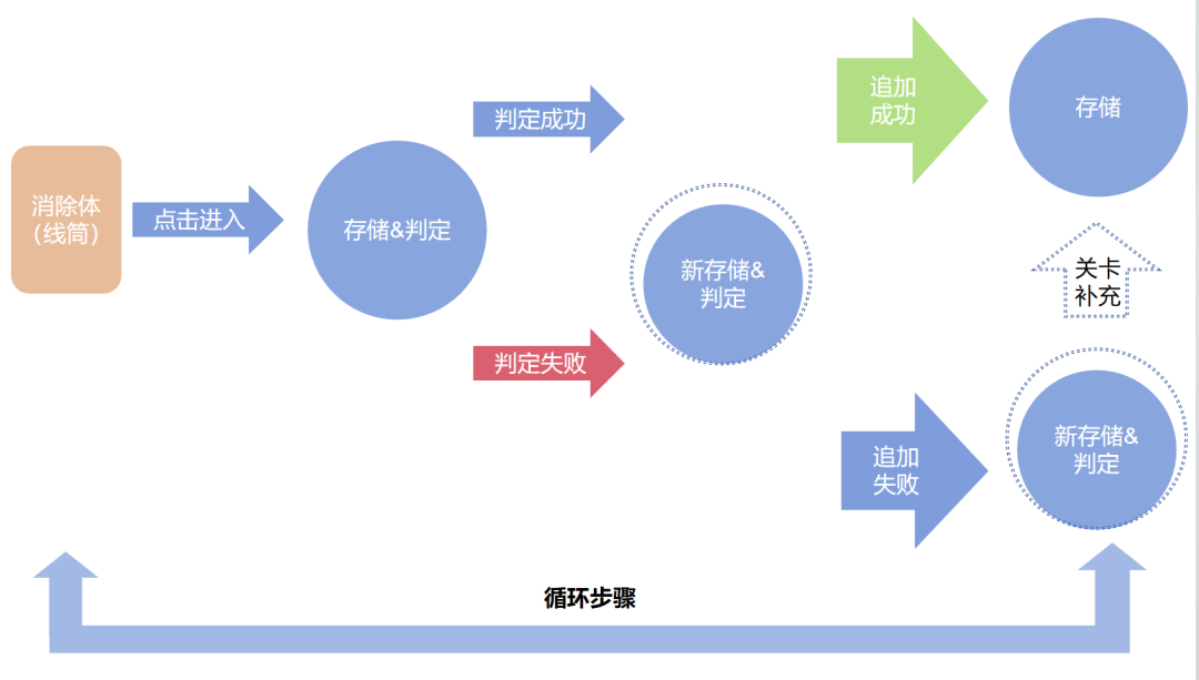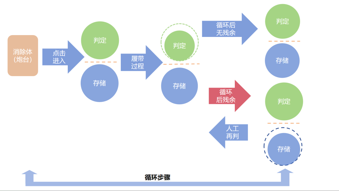 在环状设计下,消除物(关卡)虽然与消除体(炮台)形成同色,消除体在移动状态下与静态的消除物形成方位变化,从而无法一次性消除。此时,游戏鼓励玩家对单消除体进行复用。
