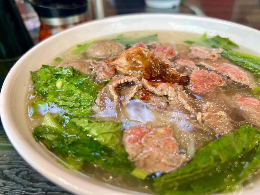 继续向前,青春回忆“以纯”背后是条骑楼街。走到中段,远远地,那股熟悉的牛骨清汤味沁入心脾——牛肉独有的香气还未被任何调料侵扰,带着丝丝萝卜的香甜,加上芹菜、炸蒜,潮汕牛肉弹牙爽滑的口感仿佛就在嘴里,忍不住深吸几口,是老家的味道!小有心机的老板在码满牛骨的汤锅上方安了架小风扇,把香味尽数送往街道,勾得人循味而来。无需招牌,气味就是最好的广告。