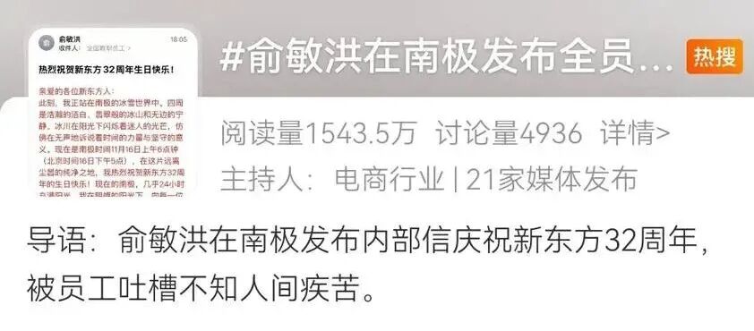 然而,很多新东方员工看到这封信后,心情可不平静,他们在社交媒体上吐槽,“您在南极看风景,我在工位赶KPI”“今夜,所有xdfer(新东方人)都是南极人”,在一股“火药味”中,这封信很快冲上了微博热搜,有1508.3万网友参与阅读和讨论。有人指责老板不体谅员工,也有网友维护俞敏洪,“老板也有玩的权利,看不惯可以离职”。