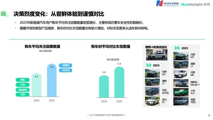在用户决策过程中,行为模式正呈现出从“尝鲜体验”向“理性对比”的显著转变。其中,用户购车时平均关注因素数量明显增长,从去年的4.2个上升至5.9个,关注焦点高度集中在整车安全性与智能化配置方面。与此同时,用户在购车前的平均对比车型数量也有较大幅度增加,且对比范围从过去以燃油车为主,全面转向与同级纯电车型进行细致比较。
