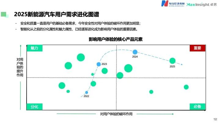 其中,从用户需求进化图谱可以清晰地看到,智能化已经从之前的分化属性和魅力属性,逐渐进化成为影响用户体验的重要因素。它涵盖智能驾驶、智能座舱、智能车机等多个方面,是吸引不少传统燃油车用户转向新能源汽车的重要原因,也是未来3至5年内不变的竞争高地。