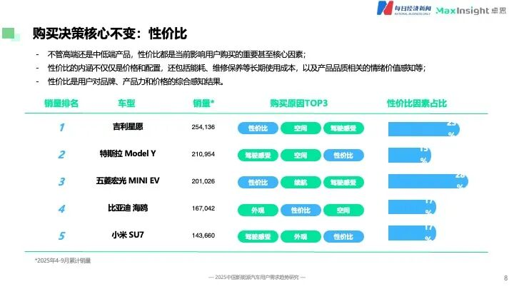 首先,性价比依然是影响用户购买决策的“定盘星”。《报告》显示,从今年4月至9月的累计销量排名与购买原因分析来看,无论是售价10万元以内的吉利星愿、五菱宏光MINI EV,还是定价20万元以上的特斯拉Model Y、小米SU7,其购买原因中“性价比因素”均位列前三。
