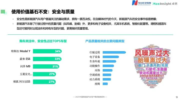安全与质量,是用户赋予的“一票否决权”与不可逾越的底线。《报告》指出,安全性是新能源汽车用户普遍关注的基础需求,在用户决策中拥有“一票否决权”。与此同时,产品质量问题也呈现出新特征,除了行驶质量问题(如风噪、胎噪)外,更多与车机系统、智能化配置等电子设备相关。其中,对于增程和插混车型,则需同时应对油车和纯电车型的双重挑战,质量管理复杂度更高。