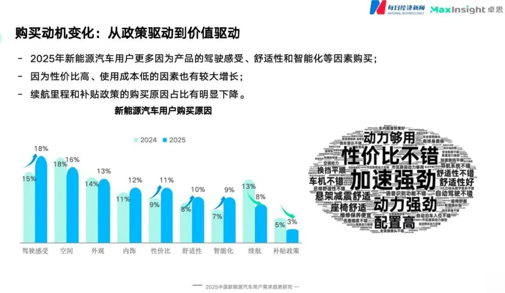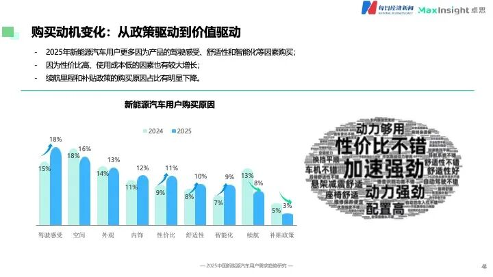 在购买动机上,驱动力的核心已从“政策”移向“产品”。《报告》显示,用户更多因为产品的驾驶感受、舒适性和智能化等内在价值而出手,同时性价比高、使用成本低等经济性因素也有较大提升。与之形成鲜明对比的是,续航里程和优惠补贴政策作为购买原因的占比出现明显下降。可以发现,用户的买单理由已从外在激励转向了对产品综合价值的深度认可。