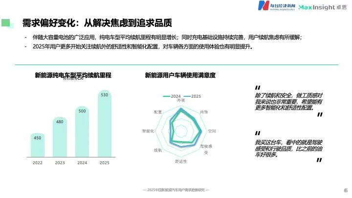 在此背景下,用户的注意力自然转向更高层次的体验维度。《报告》指出,2025年用户开始更多地关注续航之外的舒适性与智能化配置,对车辆整体使用满意度也提出了更高要求。