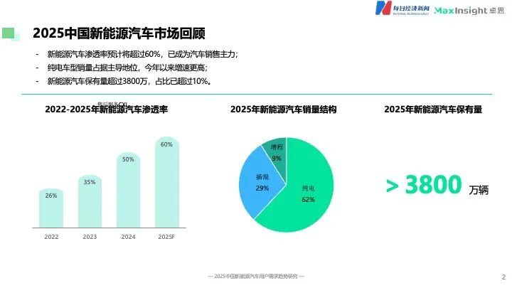 2025年,中国新能源汽车产业迎来历史性拐点。卓思天成(即北京卓思天成数据咨询股份有限公司)日前发布的《2025中国新能源汽车用户需求趋势研究》报告(以下简称《报告》)显示,2025年,新能源汽车保有量有望超过3800万辆,在汽车总保有量中占比超过10%,市场渗透率预计突破60%。在整体销量结构中,纯电车型占据主导地位,占比预计达到约60%。