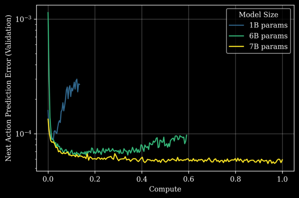 Generalist的规模化实验表明,GEN-0模型必须足够大,才能吸收海量的物理交互数据。
