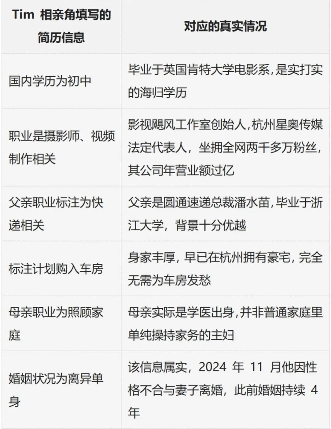 (网友所总结的Tim相亲角简历和真实情况的对应表格)