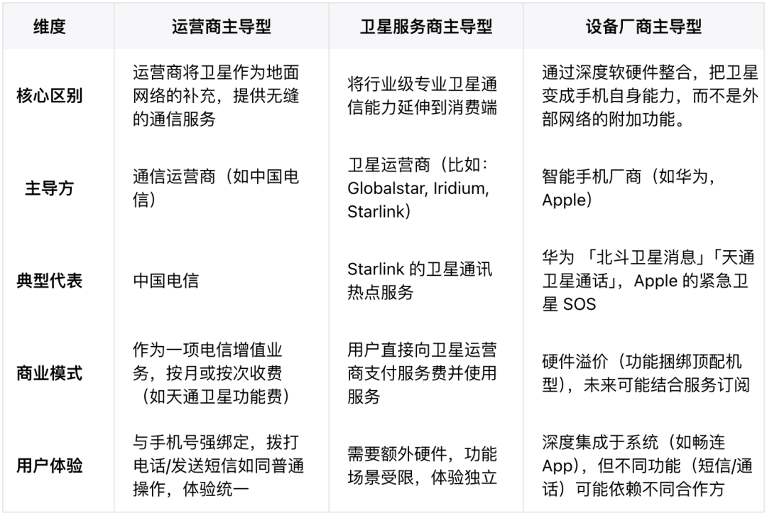 与此类似,「卫星服务商主导型」通常也采用单独套餐的形式,只是需要额外购买终端设备(如Starlink Kit);而「设备厂商主导型」则短期内更多通过机型溢价与系统功能捆绑,长期来看则可能变为另一种「套餐」。