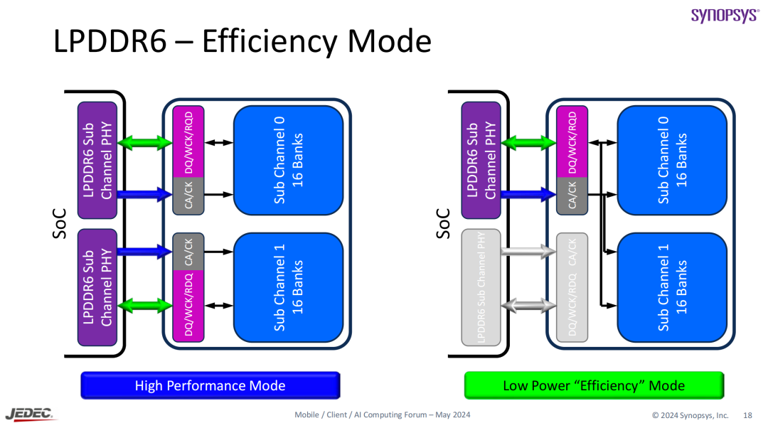 这就使得LPDDR6内存能够支持三种数据传输模式的切换,做到带宽的“按需分配”: