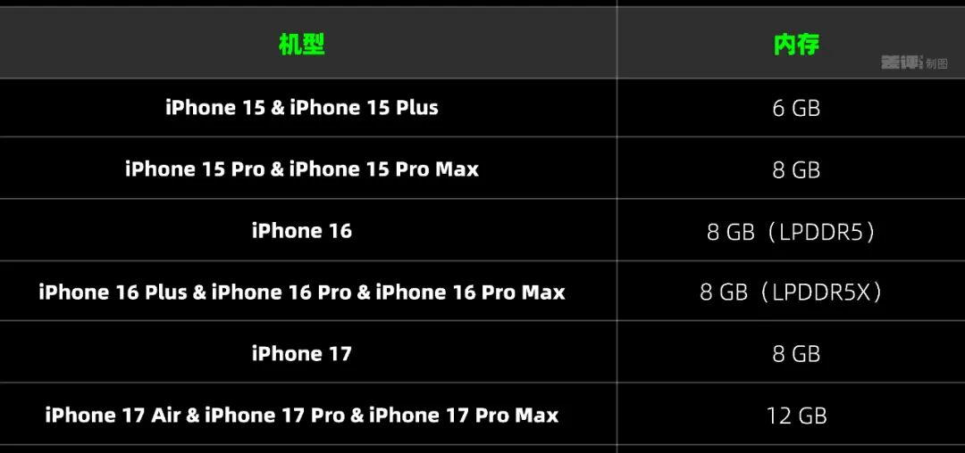 iPhone 16全系标配8 GB内存,但Pro系列的内存规格更高