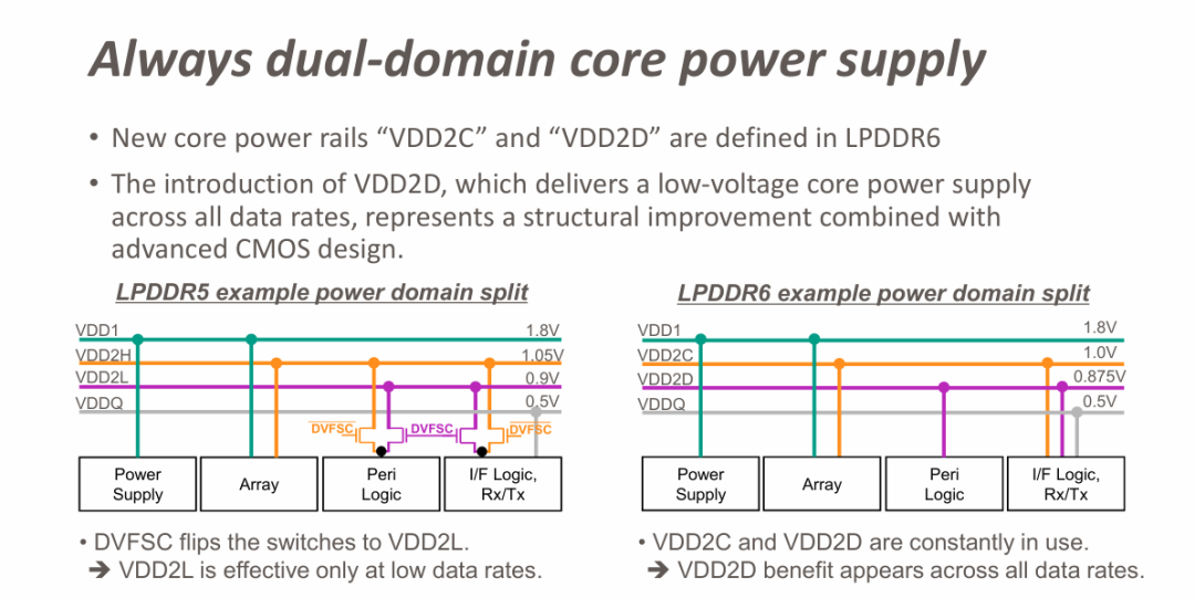 说人话就是,LPDDR 6强制规定,将常规供电(VDD2C)与低功耗供电(VDD2D)分成了两条电源轨。在内存工作的高频段,使用稍高的电压保证性能,在空闲时切换到更低的电压,降低功耗。
