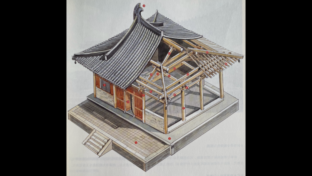 有学者做了一些解剖,我们看到建筑里面的形式,是由木柱支撑的,它的墙体是都不承重的,这个也是我们中国古建筑一大特色。尤其看到建筑的梁架体系,是非常明朗非常清晰的,在里面每一根椽子,每一根梁,都发挥着它们的结构作用。