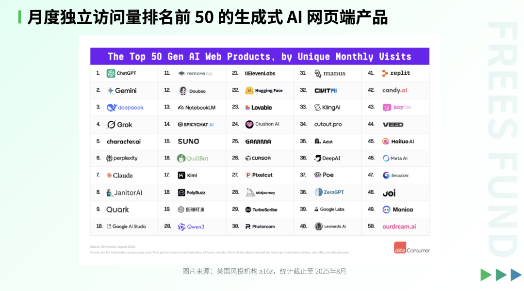 其中,中国团队的表现尤为亮眼。以夸克为例,根据美国风投机构a16z今年8月的统计,其全球网页端访问量已跻身第九,移动端(仅统计iOS手机客户端)则位列第47,若计入安卓手机客户端数据,排名有望进一步提升。类似地,DeepSeek、字节、阿里等大厂孵化的应用也在海外市场快速渗透。