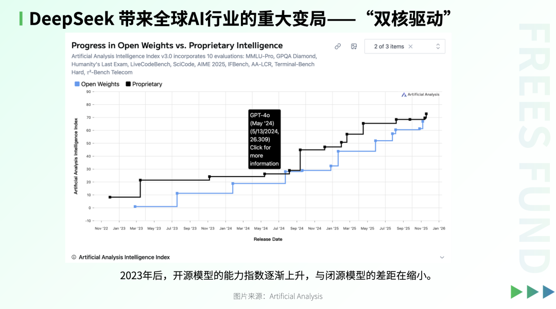 从技术角度看,“双核”首先指向闭源与开源这两种截然不同的发展范式。闭源大模型由科技巨头主导(以OpenAI为代表),强调性能领先、产品闭环与商业变现;开源大模型则先由具备资源实力的组织主导(以DeepSeek为代表),在开源基础上依托社区协作、生态共建和透明迭代,近年来展现出强大的生命力。