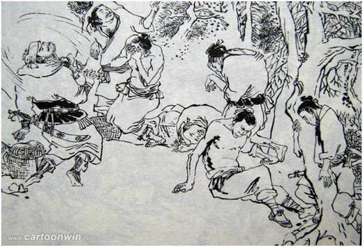 第三首酒歌则是出现在《第十五回 杨志押送金银担 吴用智取生辰纲》里。这个章节的后半部现已编入初中语文课本,它叙述的是晁盖、吴用等草莽英雄与大名府军官杨志斗智斗勇的故事。杨志为了应付不测可以说是处处小心,事事留意。开始还是趁凉行路,后来到了“人家渐少,行客又稀”的山路地带,为安全起见,改为天正热时赶路。这本是顺应地势的防范之策,怎耐天气酷热、担子沉重、山路难行,他又不讲究方式方法,“轻则痛骂,重则藤条便打”,军汉们“雨汗通流”,苦不堪言,怨声载道。这时刚好看见远远地一个人,挑着一付担桶,唱上冈子来:“赤日炎炎似火烧,野田禾稻半枯焦。农夫心内如汤煮,公子王孙把扇摇!”
