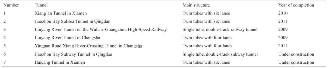 这些隧道大部分为双洞隧道(单层或双层),但也有单洞双层公路隧道(上海上中路隧道)。隧道所穿越的典型地层有华东的软土地层、成都和兰州的卵石地层、华南的强度差异大且强度高的复合地层等代表性的地层。目前建设中的汕头苏埃通道是挑战性极大的盾构海底隧道。