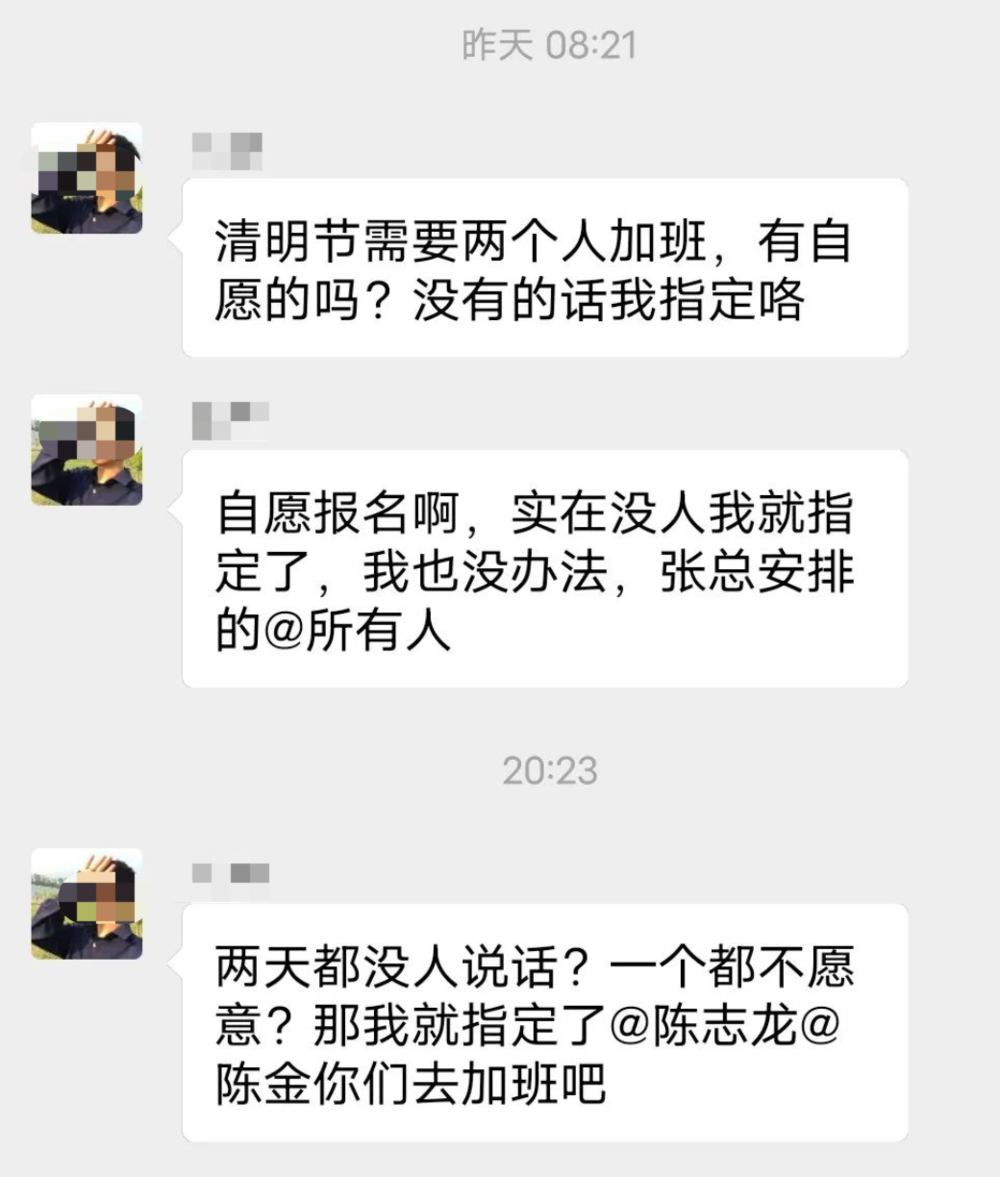 早上8点21分,软件开发课微信群,管理者董俊询问清明节需要两个人加班,有无自愿?如果没有就指定。