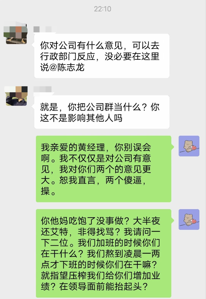 下午19点13分,成都事业部大群,陈志龙表达了对黄珂林的强烈不满,表示太多无意义加班,譬如两台测试仪,安排6个人加班等。陈志龙再次表示辞职。
