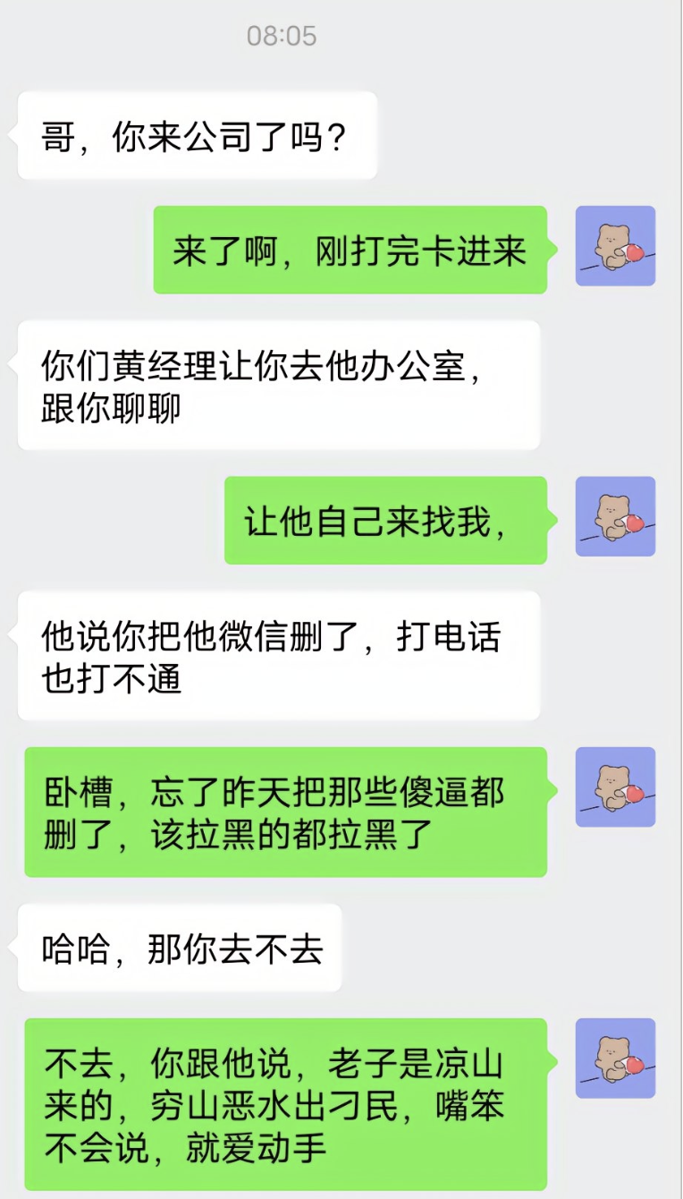 早上8点5分,黄经理请陈志龙去他办公室沟通,陈志龙表示不去。