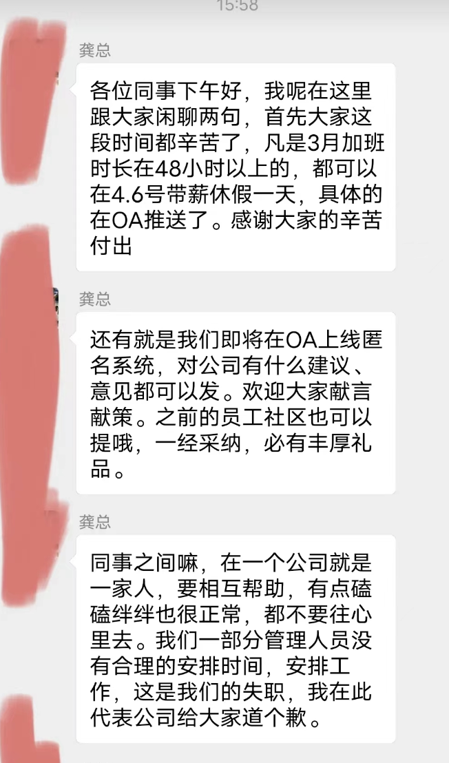 下午15点58分,成都事业部大群,龚总表示3月加班超过48小时的,4月6日带薪休假一天。OA系统上线匿名系统,欢迎员工提意见。