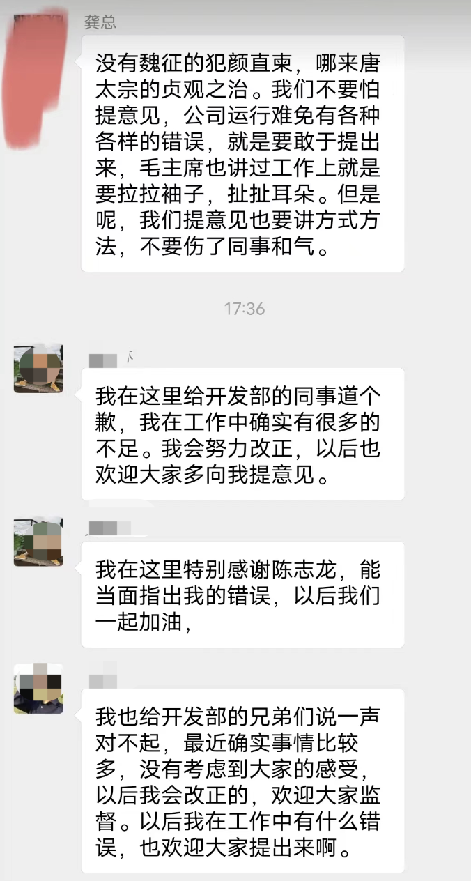 下午17点36分,成都事业部大群,黄珂林、董俊对陈志龙表示道歉。
