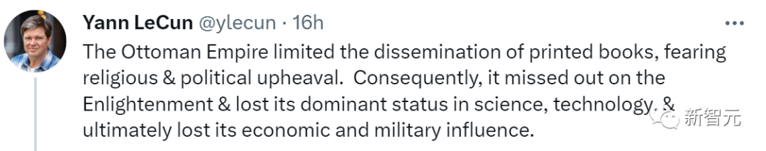 而LeCun转发了这样一篇论文。他评论道:“由于担心动荡,奥斯曼帝国限制了印刷书籍的传播。因此,它错过了启蒙运动,失去了在科学技术上的主导地位,并最终失去了经济和军事上的影响力。”