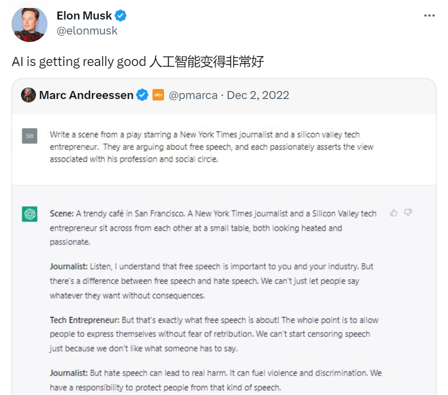 从这以后,作为推特老板的马斯克老师就开始占据“人工智能危险论”的舆论高台。