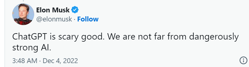 “ChatGPT 好得有点可怕了。我们距离危险的强人工智能不远了。”