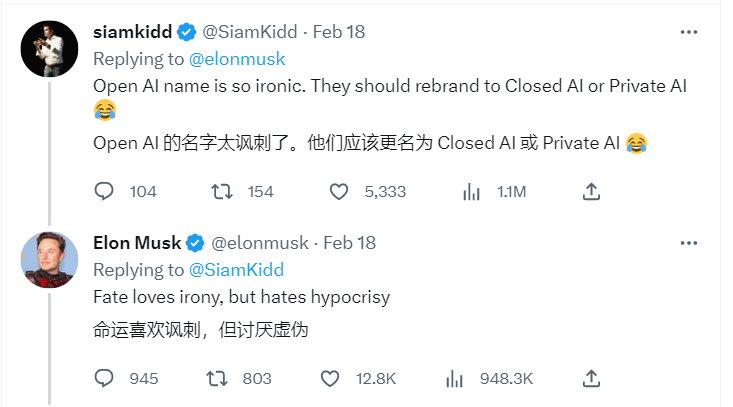2月18日,针对网友上传的与 GPT 有关审查政策的对话(GPT 表示遵守道德与语言使用相关政策,避免可能的攻击性冒犯性言论),马斯克和另一名网友讽刺 OpenAI 的“open”属性。