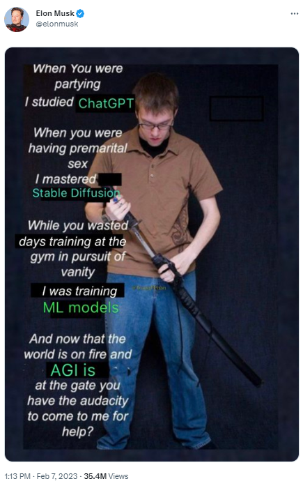 马斯克还抨击了那些对 AI 危险性无动于衷的人。他发了一张梗图:“当你参加派对时,我研究了 ChatGPT。当你有婚前性行为时,我掌握了 Stable Diffusion。当你为了追求虚荣而在健身房浪费时间训练时,我正在训练机器学习模型。现在全世界都要完犊子了,AGI 都到眼跟前了,你好意思来找我帮忙了?”