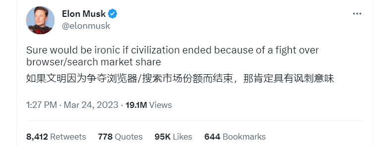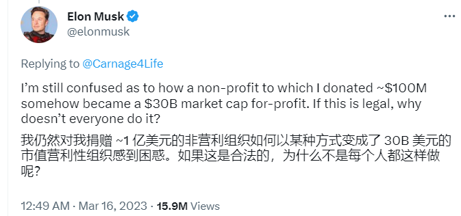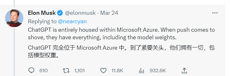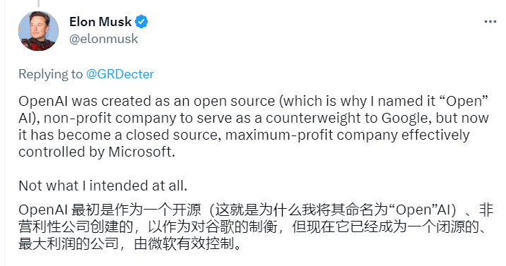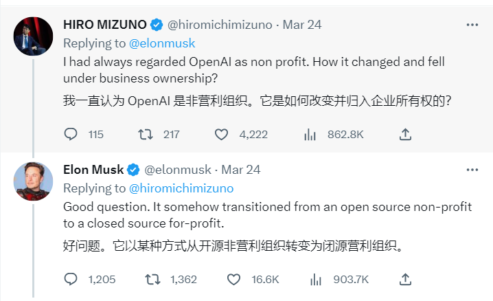 3月15日,马斯克又批评 OpenAI 违背了其成为开源非营利组织以制衡谷歌的初衷。