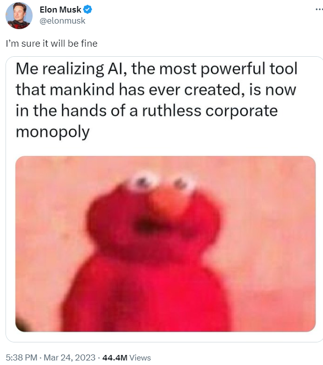 OpenAI 和微软都没有对马斯克的批评进行官方回应,3月30日,他在推特上发了一条“我相信一切都会好起来的”和一个 Elmo 表情包,其中写道:“我意识到人工智能是人类创造的最强大的工具,现在掌握在无情的公司垄断手中。”