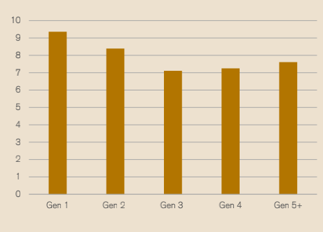 而在代际所创造的财富回报中,第一代和第二代创造的回报约是第三代和第五代或更多后代的2倍。这也就是说,处于生命周期早期阶段的公司,往往表现出更为强劲的增长速度。随着与继承有关的问题越来越普遍,后几代人可能会面临更多的成长挑战。