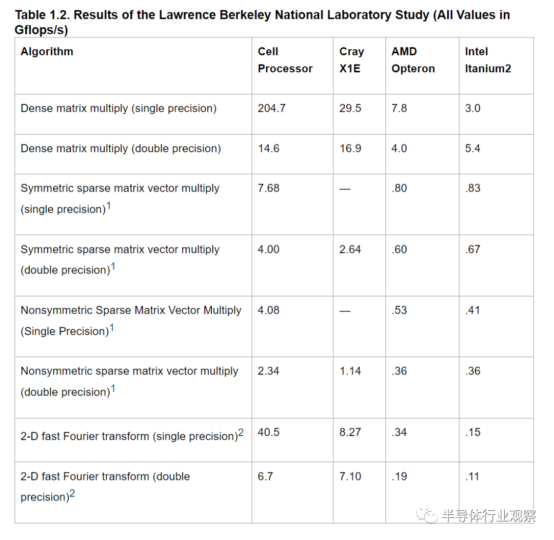 (劳伦斯伯克利国家实验室针对Cell、 AMD Opteron,英特尔Itanium2,以及Cray X1E的性能对比)