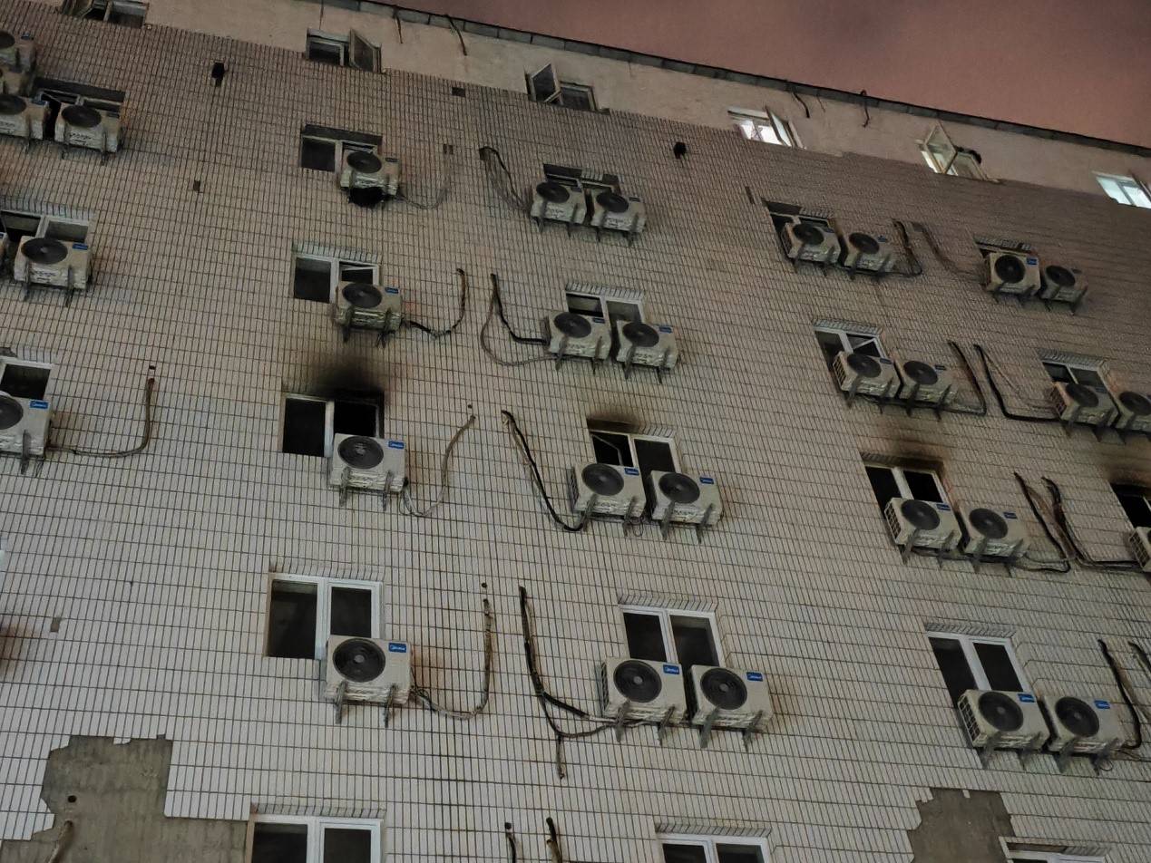经济观察网记者在现场看到,起火的楼体是一幢8层楼房,起火楼层在住院部东楼五层,这一层的外窗被浓烟熏黑,18日晚上10时许,现场还能闻到浓烟味。