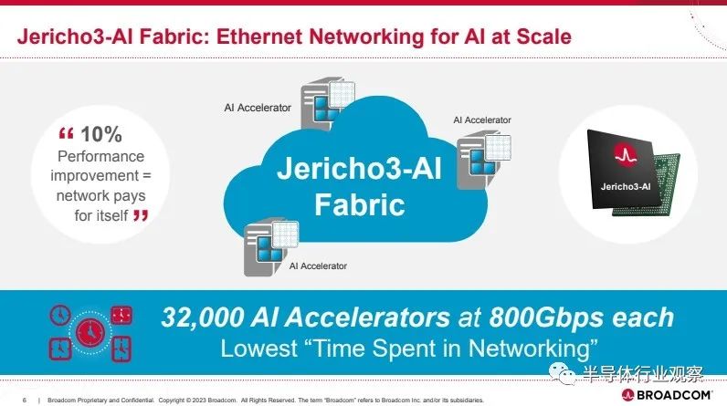 博通强调,AI 工作负载具有独特的特征,例如少量的大型、长期流,所有这些都在 AI 计算周期完成后同时开始。Jericho3-AI 结构为这些工作负载提供最高性能,具有专为 AI 工作负载设计的独特功能: