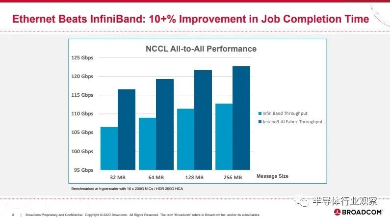 尽管如此,博通表示其 Jericho3-AI 以太网在 NCCL 性能方面比 NVIDIA 的 Infiniband 好大约 10%。