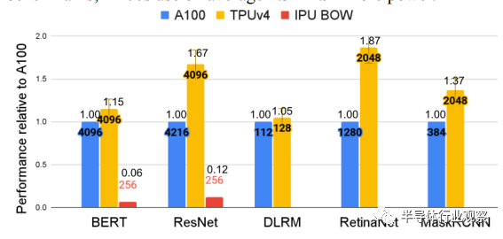 据他们在一篇博客中介绍,得益于互连技术和领域特定加速器(DSA)方面的关键创新,谷歌云 TPU v4 在扩展 ML 系统性能方面比 TPU v3 有了近 10 倍的飞跃;与当代 ML DSA 相比,提高能源效率约 2-3 倍。在与Nvidia A100 相比时,谷歌表示,TPU v4比前者快 1.2-1.7 倍,功耗低 1.3-1.9 倍。在与Graphcore的IPU BOW相比,谷歌表示,其芯片也拥有领先的优势。