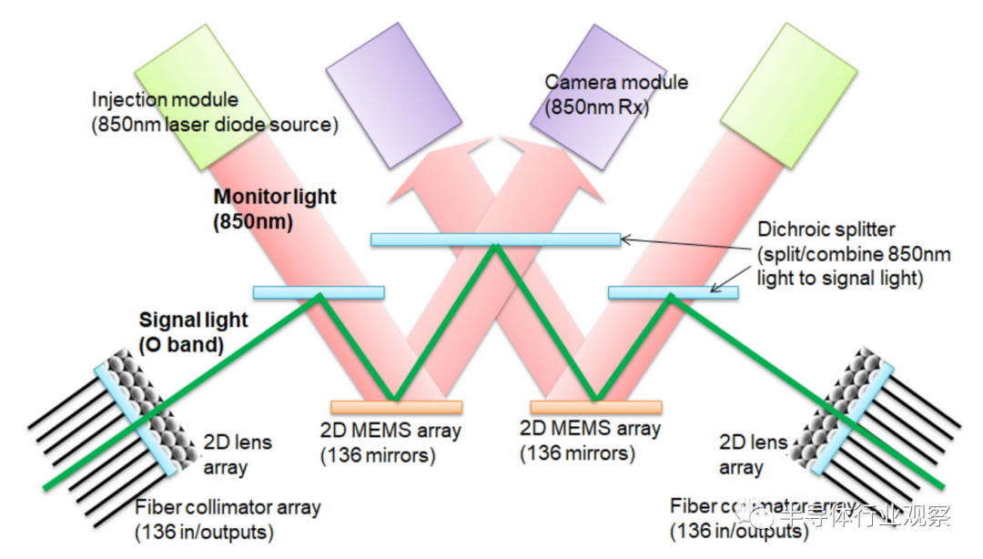 据谷歌介绍,OCS 动态重新配置其互连拓扑,以提高规模、可用性、利用率、模块化、部署、安全性、功率和性能。与 Infiniband 相比,OCS 和底层光学组件更便宜、功耗更低且速度更快,不到 TPU v4 系统成本的 5% 和系统功耗的 5% 以下。下图显示了 OCS 如何使用两个 MEM 阵列工作。不需要光到电到光的转换或耗电的网络分组交换机,从而节省了电力。