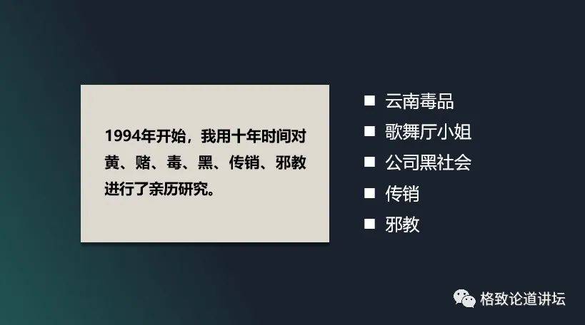 于是,我用了10年的时间,用类似于亲历的田野调查的方式,和各种各样的社会底层违法、越轨和犯罪的人打交道,主要涉及的就是黄、赌、毒、邪,邪也就是传销、邪教和黑社会。